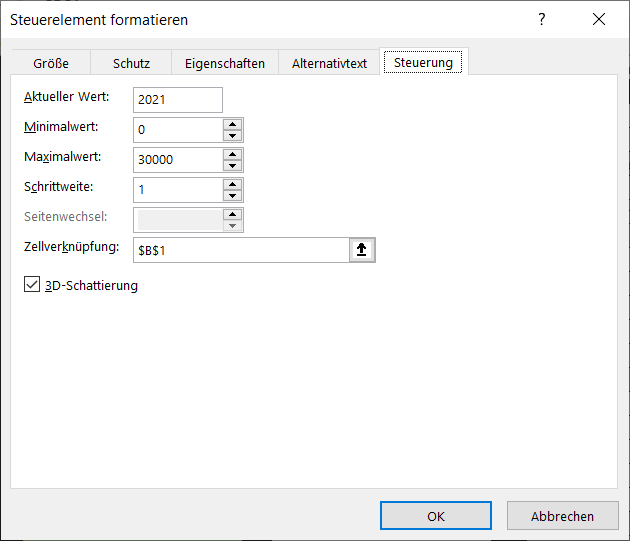 • Kontextmenu zum Steuerelement / “Steuerelement formatieren”, Zellverknüpfung eintragen, gewünschten Zahlenbereich/Startwert eintragen
