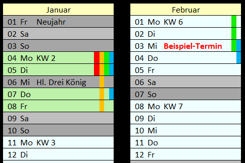 Kalender mit Schulferien, Terminen und farbigen Urlaubsbalken für bis zu 4 Personen