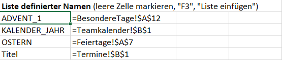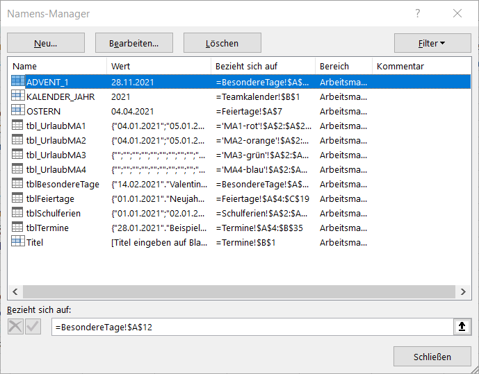 Beispiel: Namensmanager mit definierten Namen