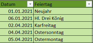 Beispiel: Angenommen es sind auf irgendeinem Tabellenblatt die Feiertage des aktuellen Jahres erfasst. In der ersten Spalte steht das Datum in der zweiten Spalte der Feiertag: